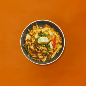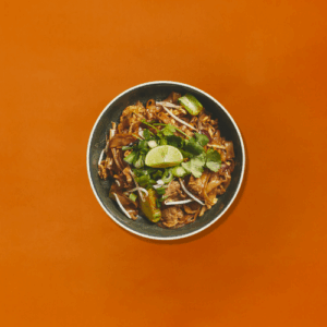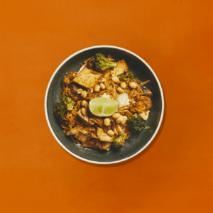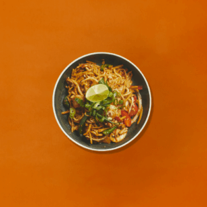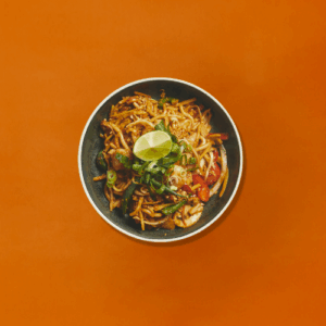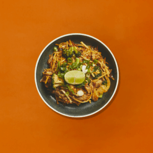 Udonnudler • Tofu • Squash • Sukkerærter • Babymajs • Teriyaki sovs • Forårsløg • Peanuts • Lime