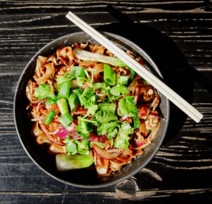 Risnudler • Kylling • Babymajs • pebermix • broccoli • Hot Sichuan sovs • forårsløg