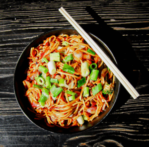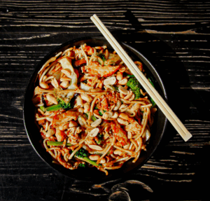 Æggenudler • Kylling • Broccoli • peberfrugt • Østers sovs • forårsløg • Skal afhentes inden 15:30