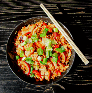Ris • Kylling • Ananas • pebermix • løg • Karry sovs • forårsløg